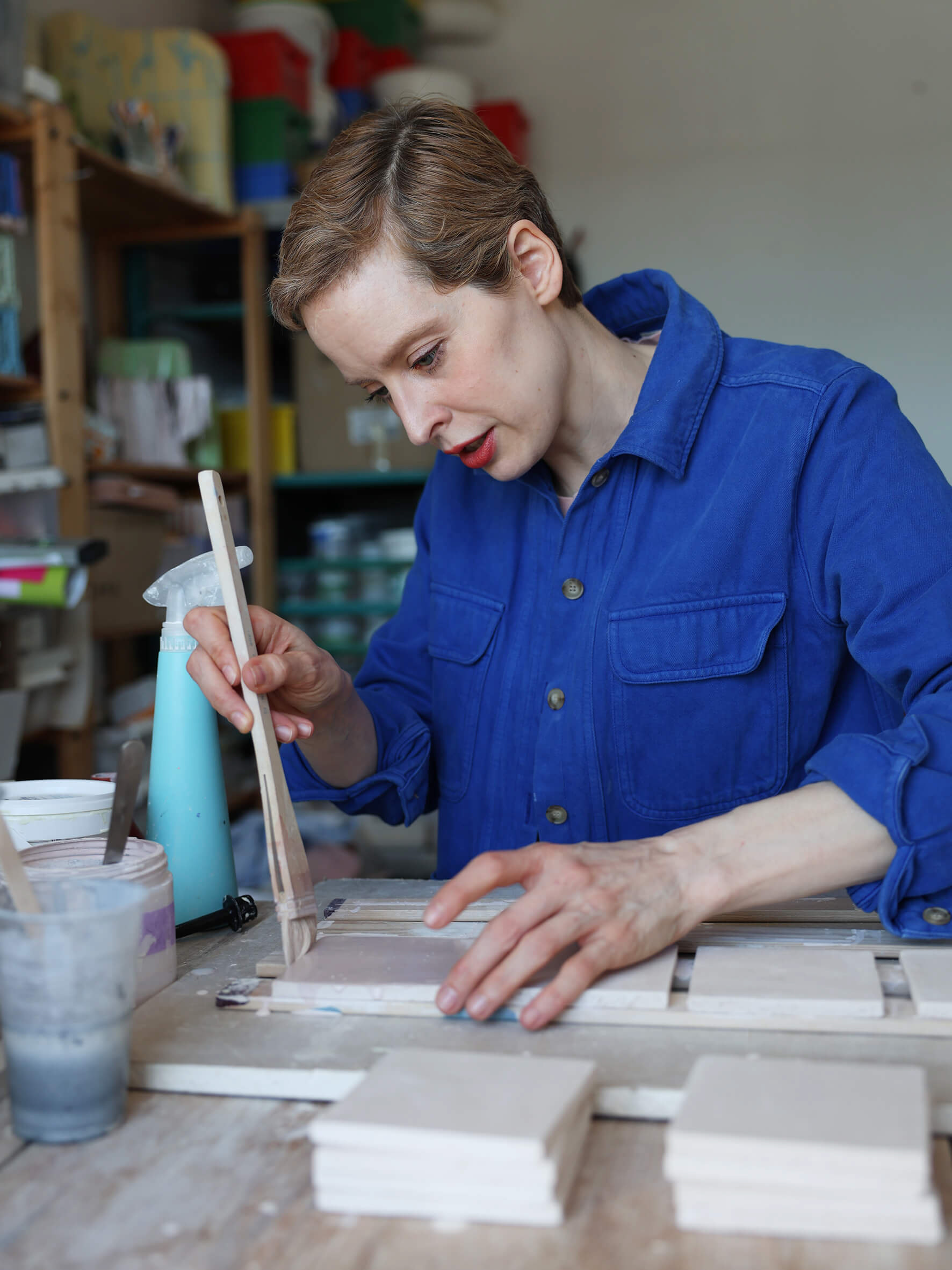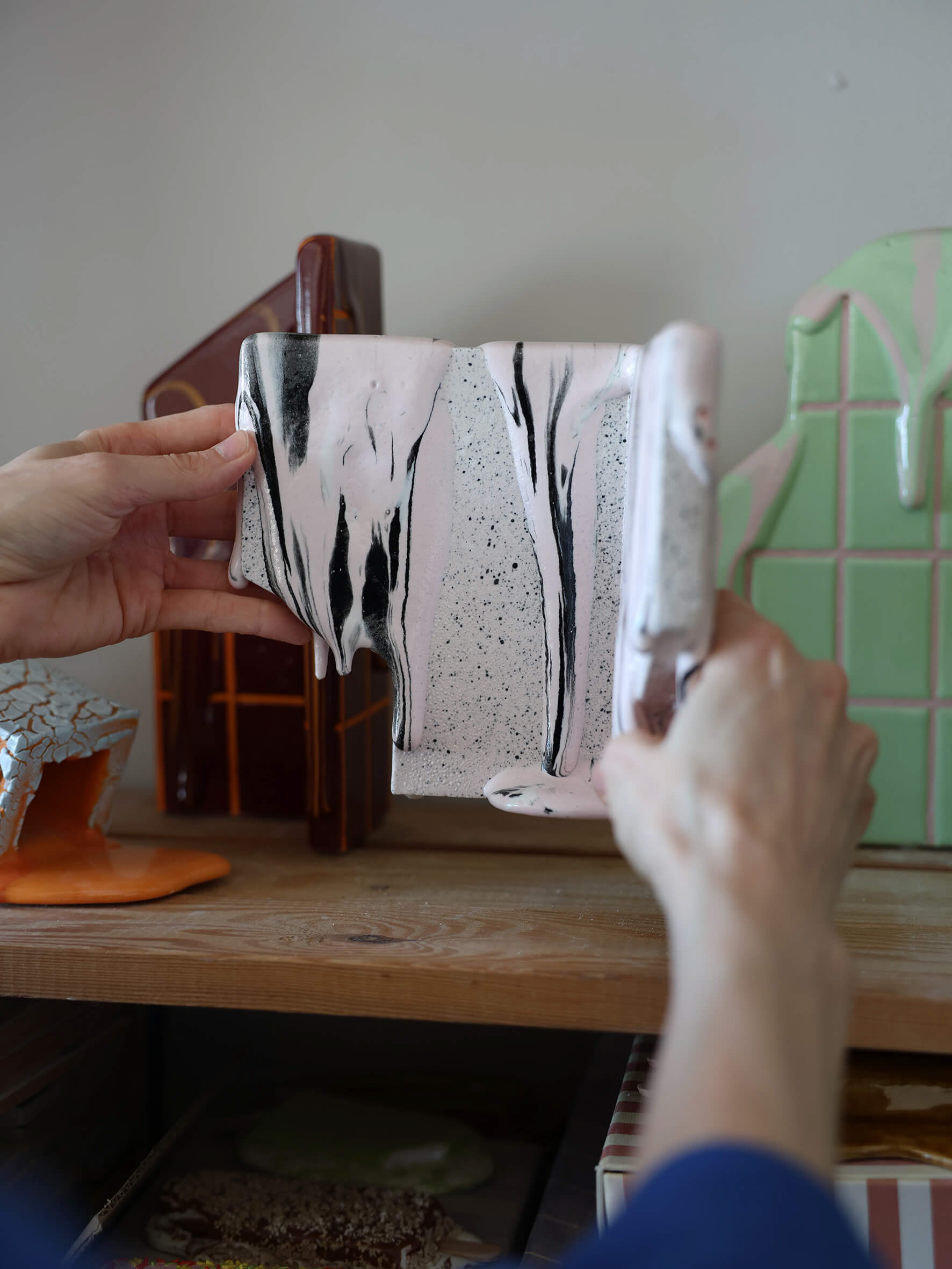 In her work, she draws on architecture and public spaces to explore themes such as transformation, time, control, and transience. Central to her practice is also a material-based exploration of ceramic surfaces and glazes.