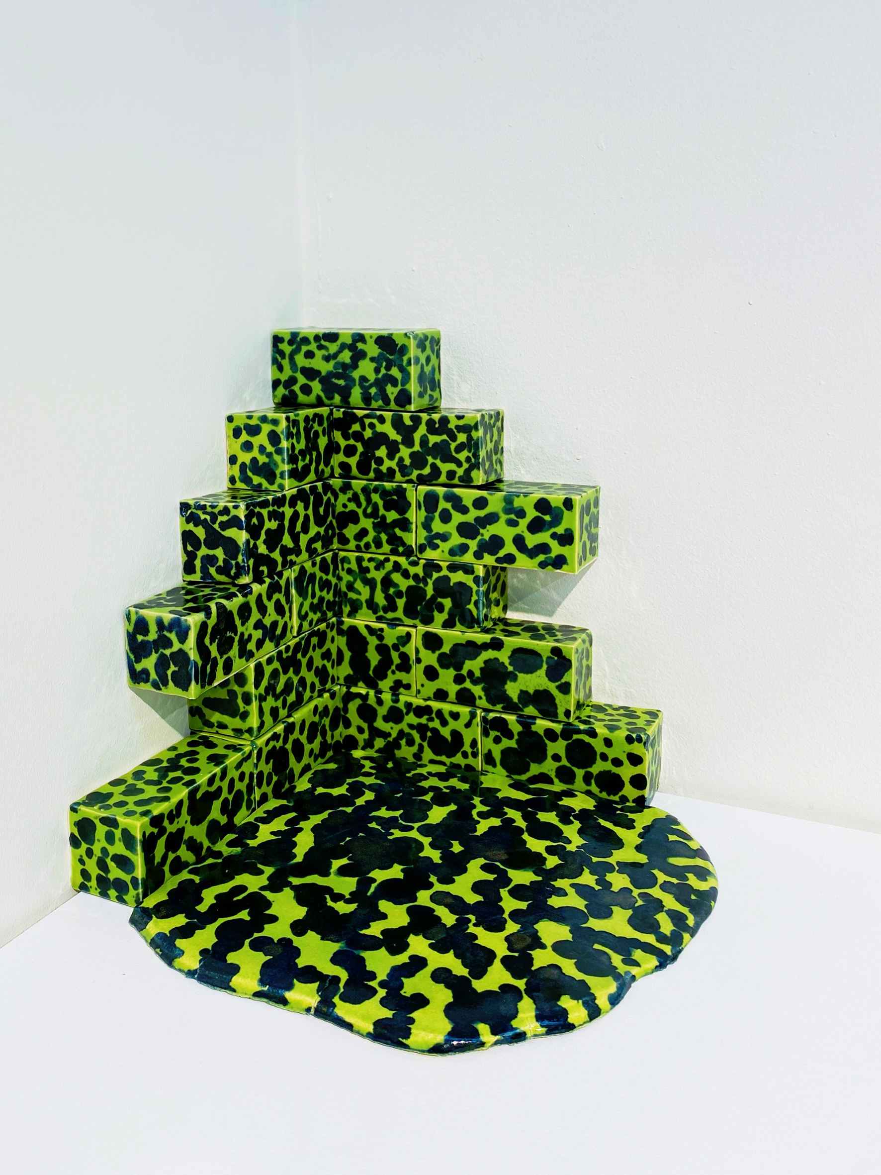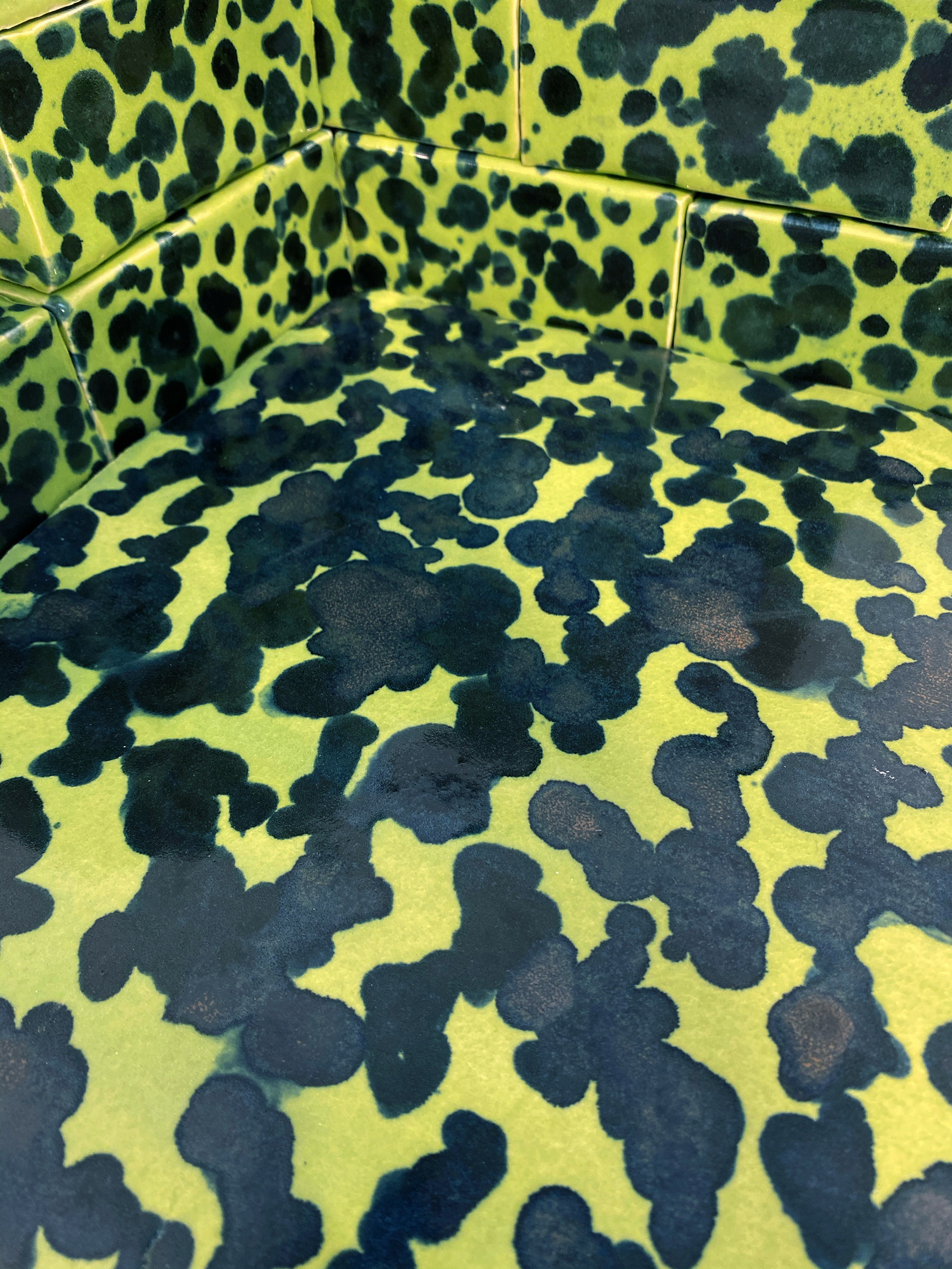 Based on the phenomena of aposematism and mimicry in the animal world, the work Party Animal explores topics such as social phobia and social protection mechanisms. Just as animals with their spots, colors and patterns can signal danger to scare away predators, humans can use surface as armor in social contexts. The sculpture is visible and takes up space, but would rather blend into the wall and sink through the floor. The piece was shown at the group exhibition ”Spots” at Form & Designcenter in Malmö 2023, in collaboration with Konsthantverkscentrum.