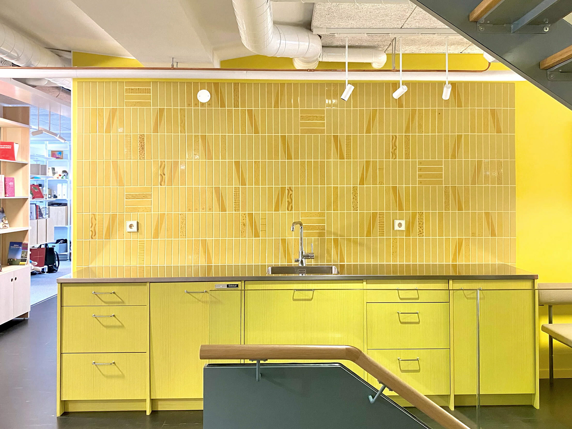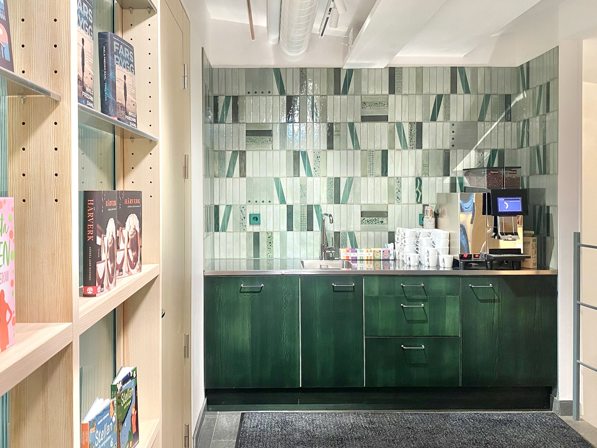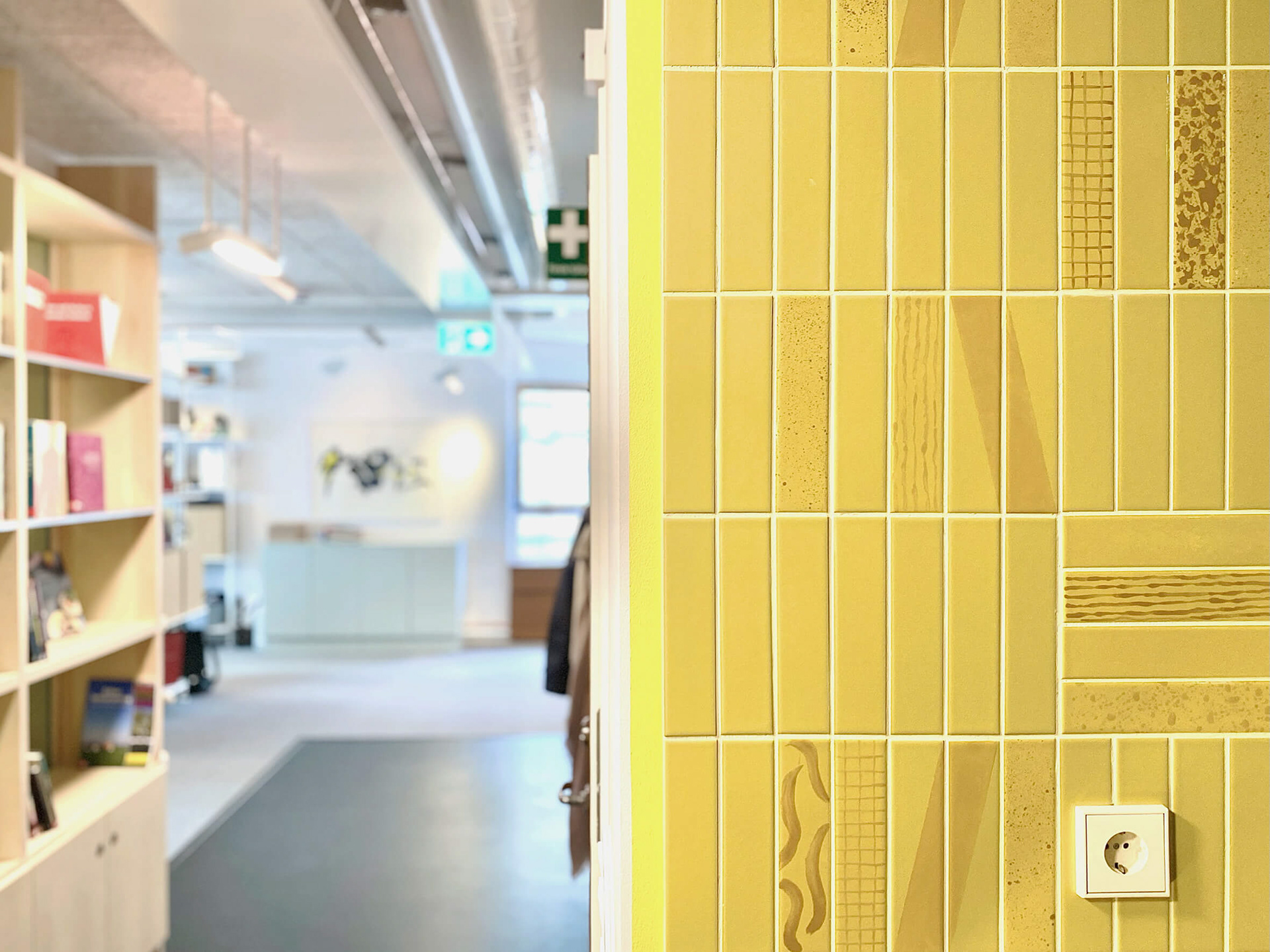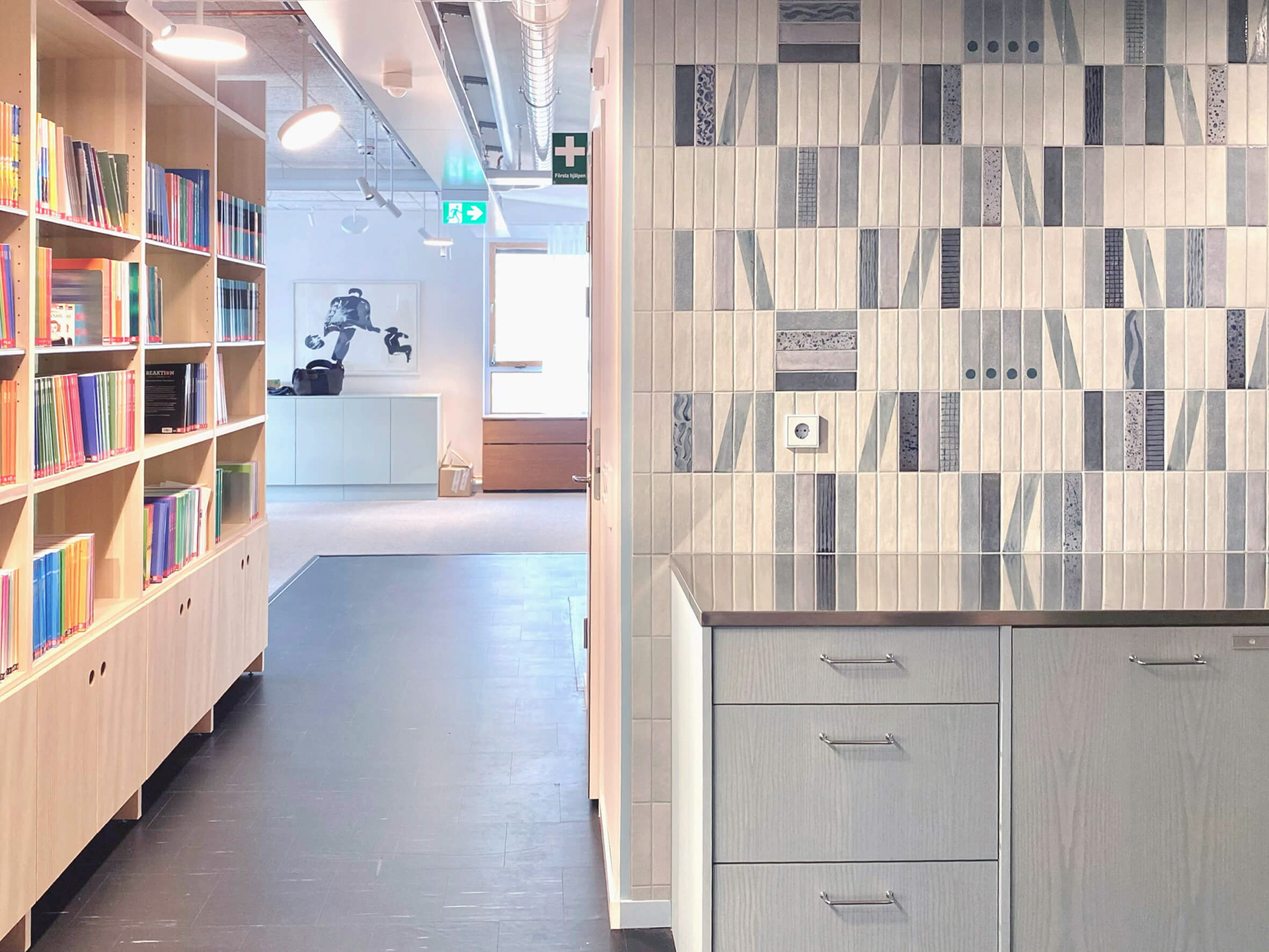 A site-specific tile artwork for the offices of publishing house Natur&Kultur, 2024, in collaboration with Studio Stockholm Architects. The artwork is based on glazed Italian stoneware tiles. I have created a pattern, partly through the different colors of the tiles, and partly by painting and re-firing over a thousand of the tiles. The tile pattern resembles a bookshelf, where the tiles form book spines. The book as a symbol evokes associations with learning, history, knowledge, stories, poetry, memories, conversations, voices and culture. There are books you return to, books that can change you and remain in your mind and heart. A collection of treasures that grows year after year. The artwork is also paying homage to a tile decoration on the building's facade, created by Signe Persson-Melin and Anders Bruno Liljefors, and also refers to the pattern "Prisma" by Sven Markelius, the building's original architect, as well as to the tiles in the Stockholm subway and public spaces of the 1960s and 70s. Each wall has its own color scheme that harmonizes with the colors of the floor plan.