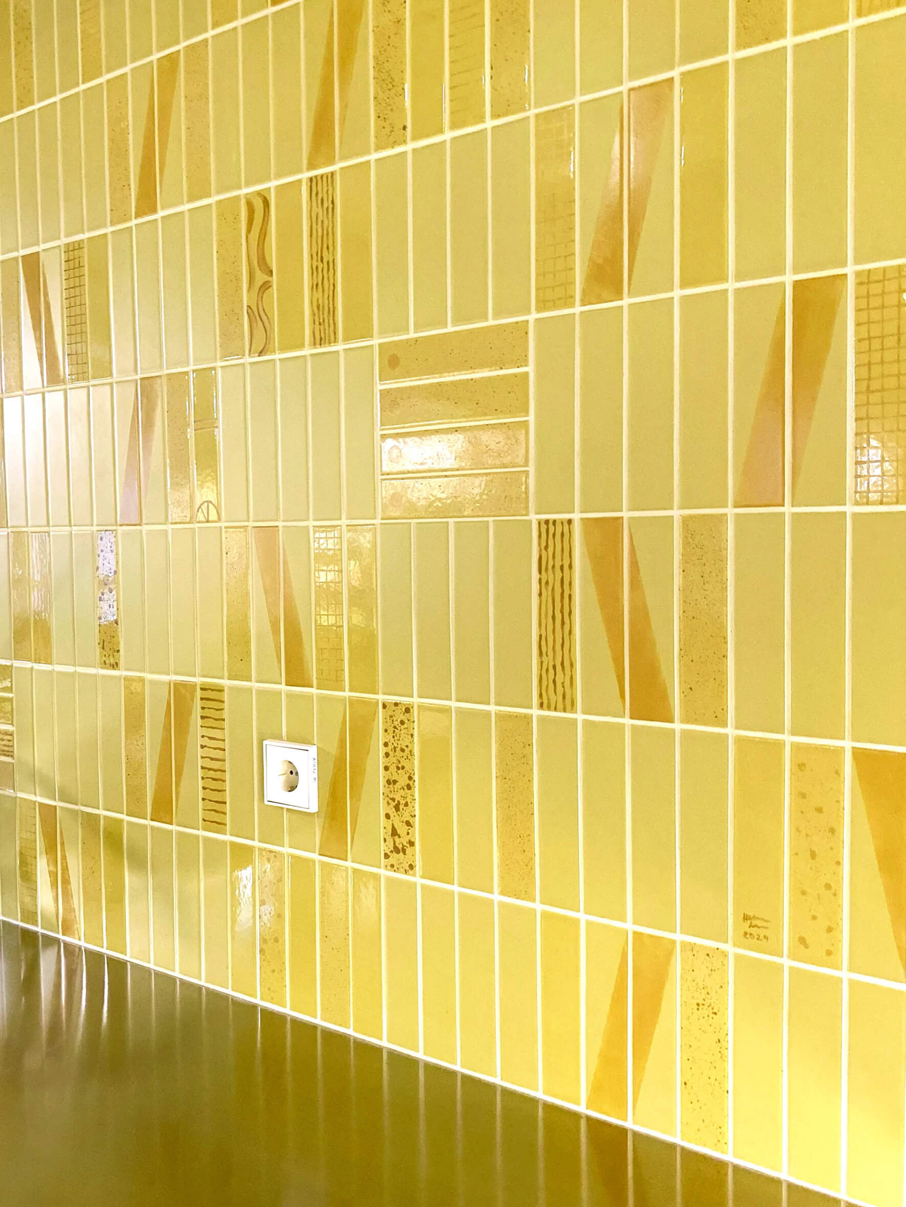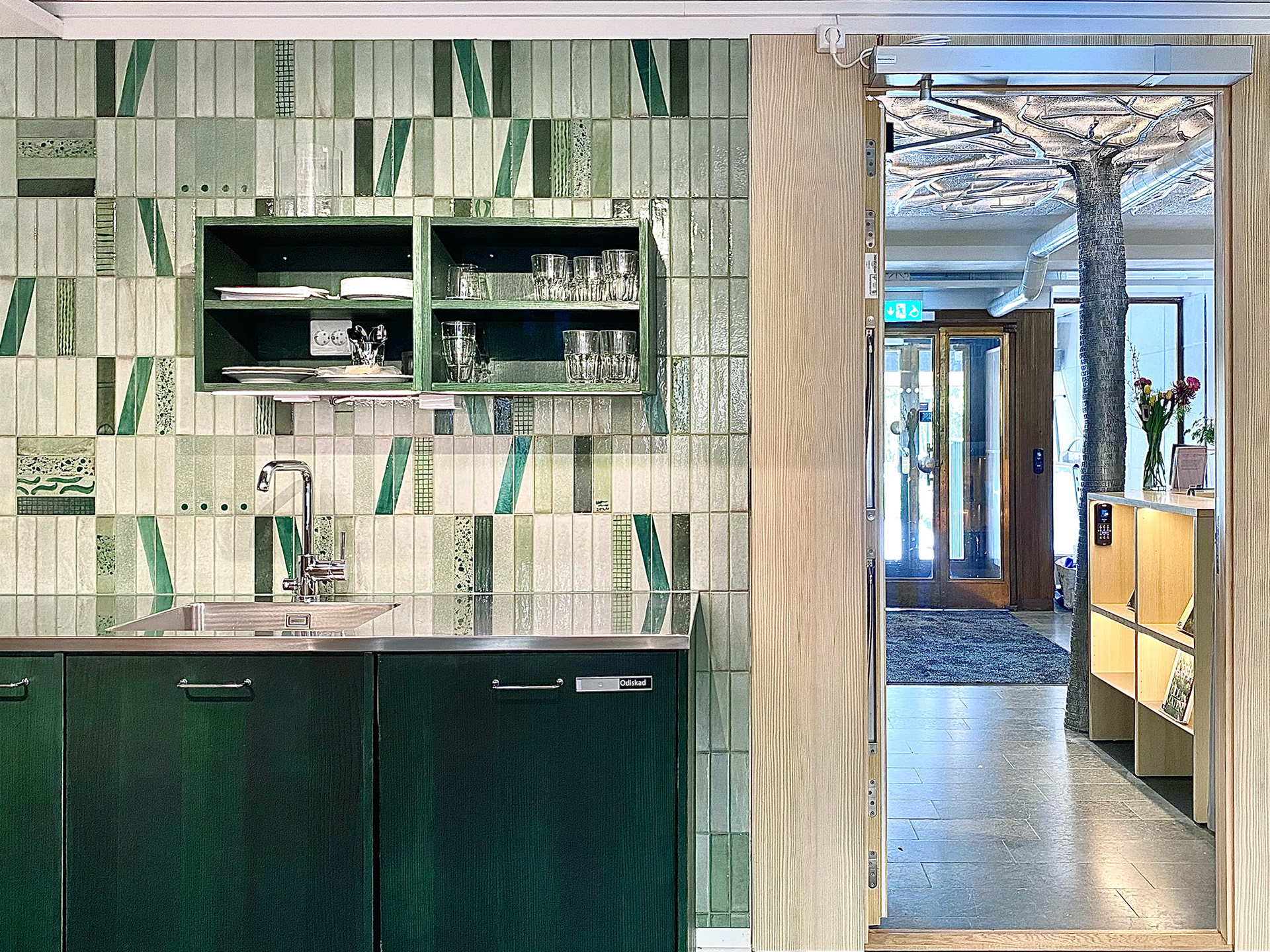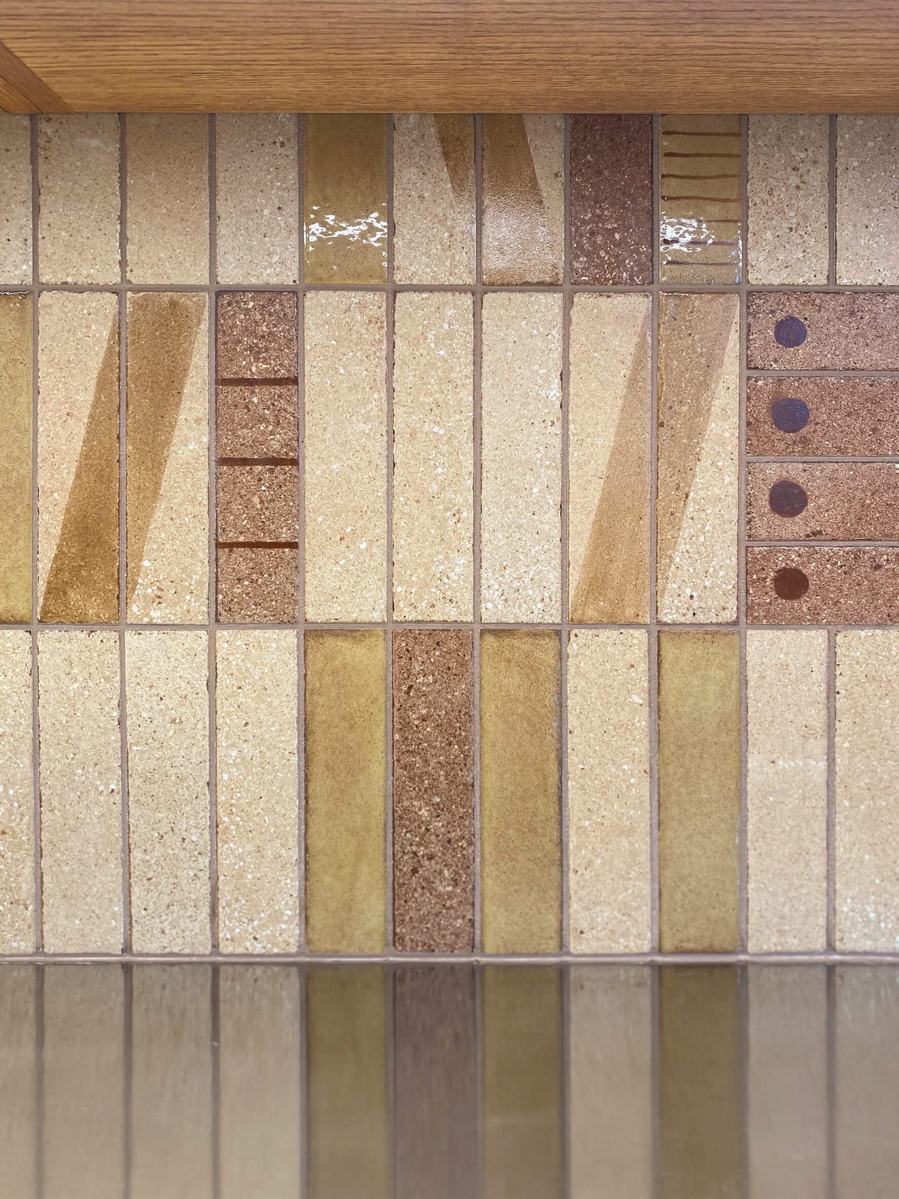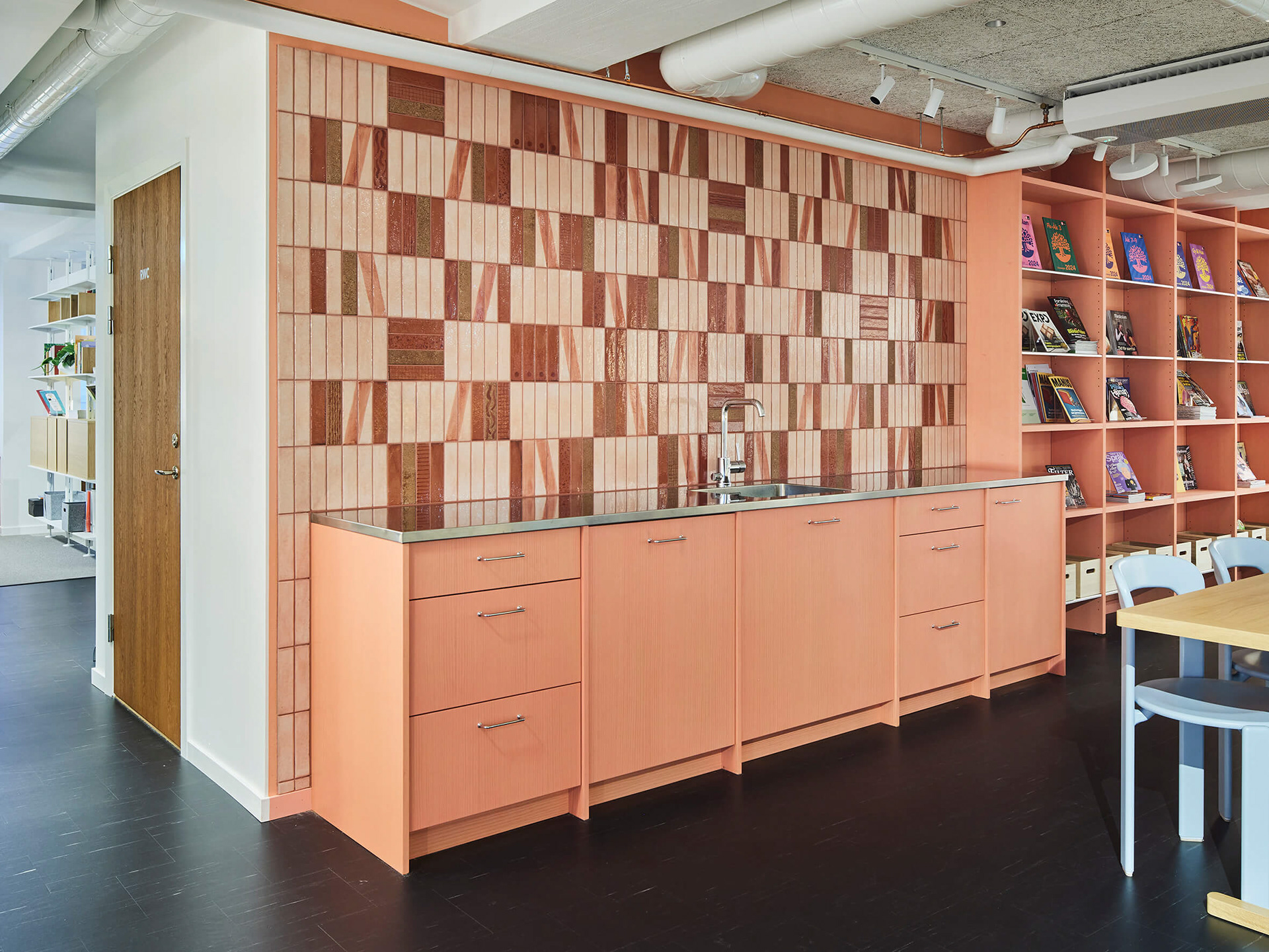 A site-specific tile artwork for the offices of publishing house Natur&Kultur, 2024, in collaboration with Studio Stockholm Architects. The artwork is based on glazed Italian stoneware tiles. I have created a pattern, partly through the different colors of the tiles, and partly by painting and re-firing over a thousand of the tiles. The tile pattern resembles a bookshelf, where the tiles form book spines. The book as a symbol evokes associations with learning, history, knowledge, stories, poetry, memories, conversations, voices and culture. There are books you return to, books that can change you and remain in your mind and heart. A collection of treasures that grows year after year. The artwork is also paying homage to a tile decoration on the building's facade, created by Signe Persson-Melin and Anders Bruno Liljefors, and also refers to the pattern "Prisma" by Sven Markelius, the building's original architect, as well as to the tiles in the Stockholm subway and public spaces of the 1960s and 70s. Each wall has its own color scheme that harmonizes with the colors of the floor plan.