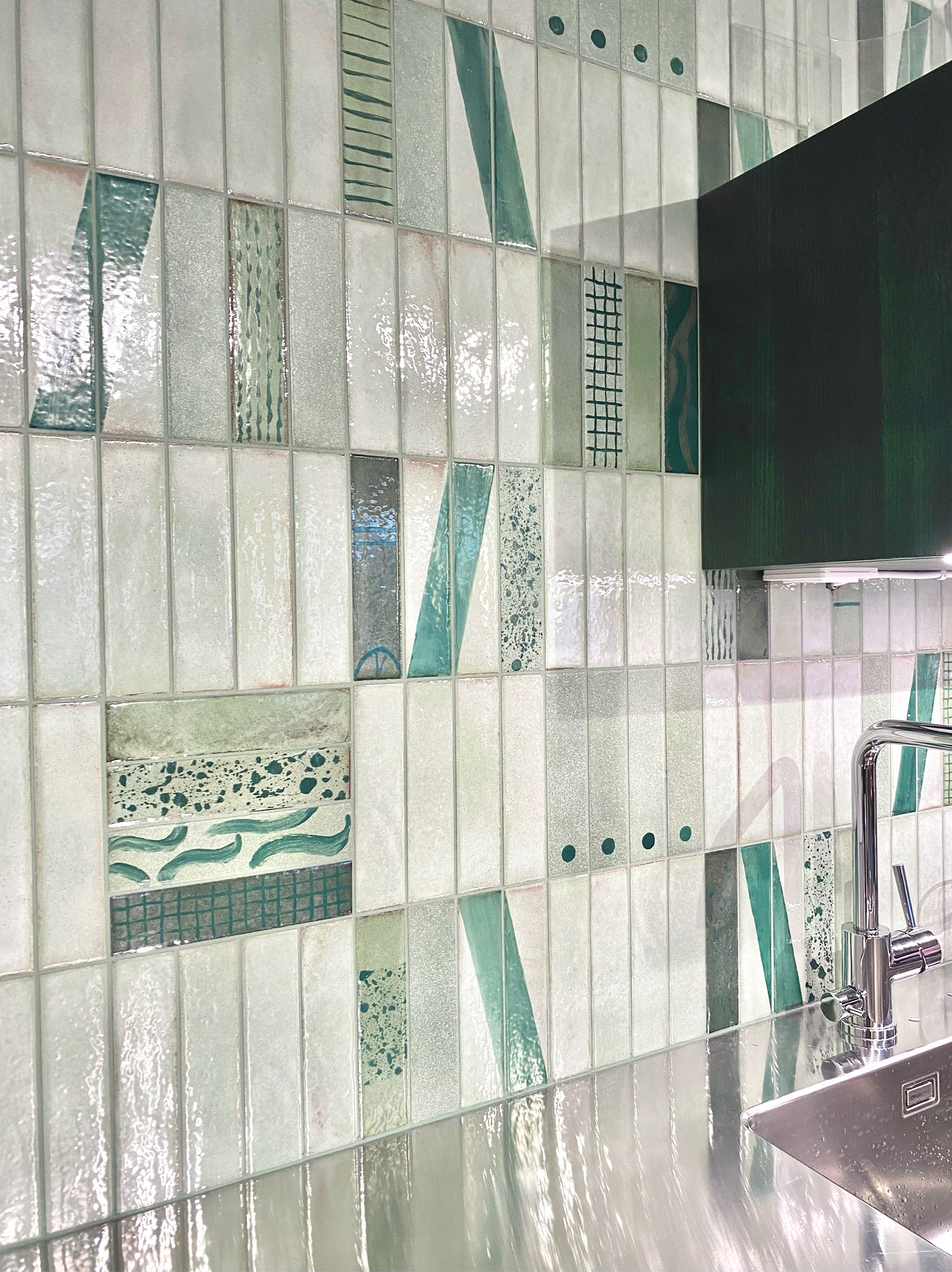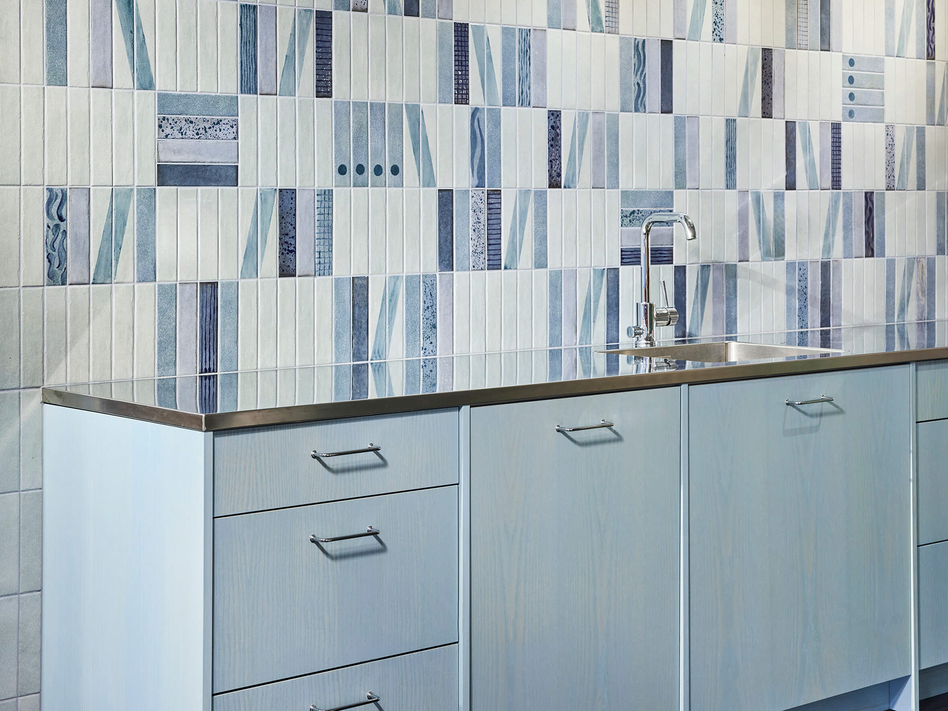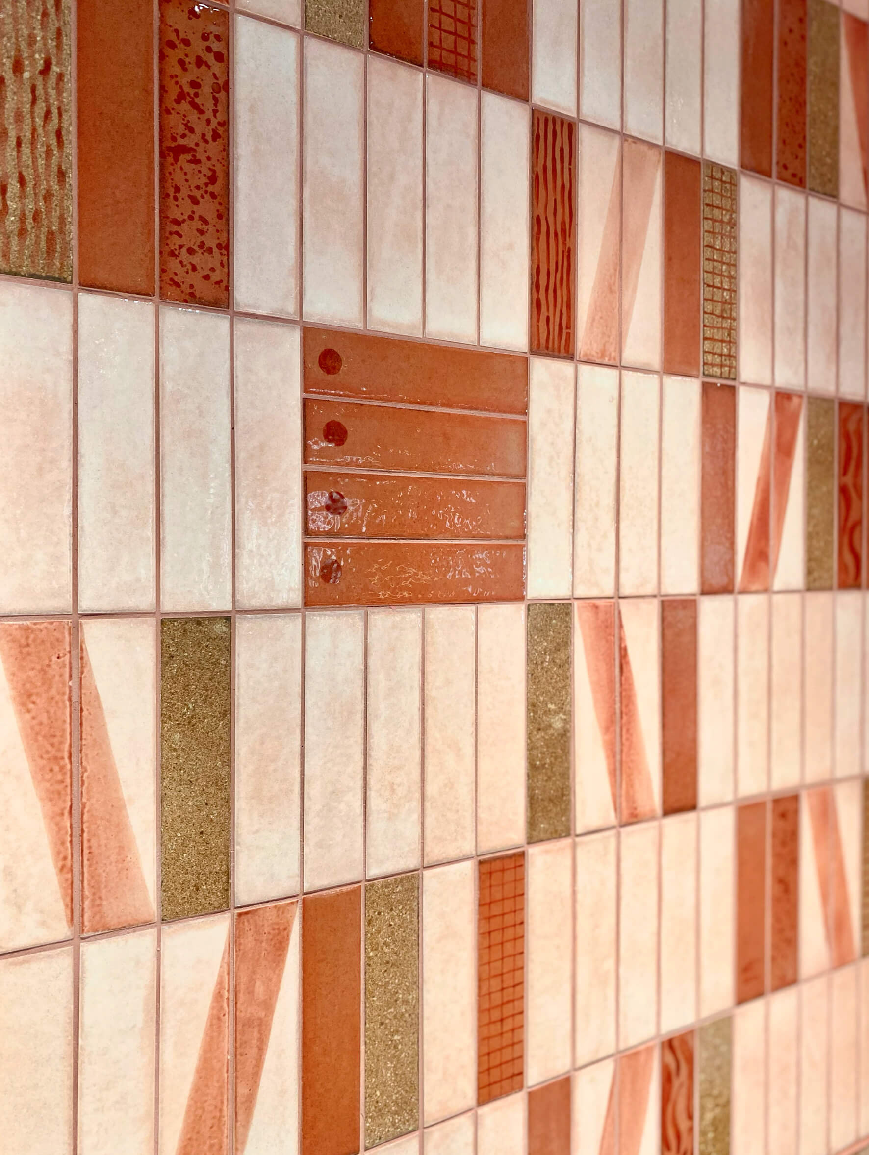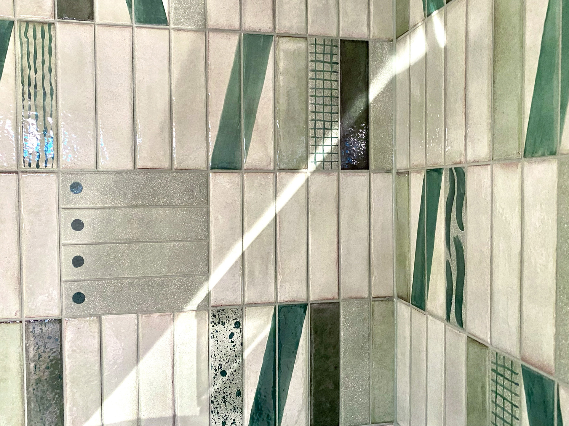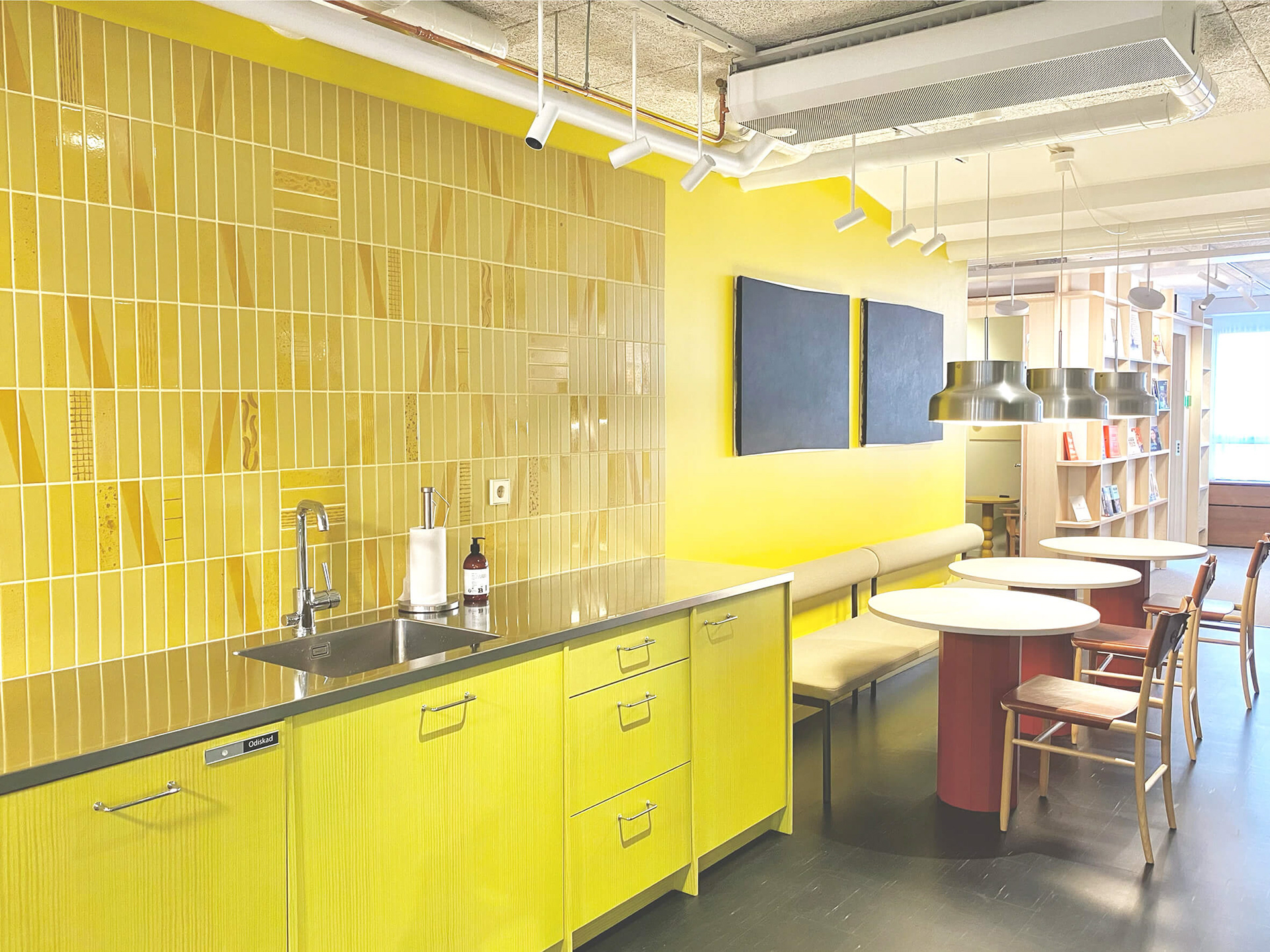 A site-specific tile artwork for the offices of publishing house Natur&Kultur, 2024, in collaboration with Studio Stockholm Architects. The artwork is based on glazed Italian stoneware tiles. I have created a pattern, partly through the different colors of the tiles, and partly by painting and re-firing over a thousand of the tiles. The tile pattern resembles a bookshelf, where the tiles form book spines. The book as a symbol evokes associations with learning, history, knowledge, stories, poetry, memories, conversations, voices and culture. There are books you return to, books that can change you and remain in your mind and heart. A collection of treasures that grows year after year. The artwork is also paying homage to a tile decoration on the building's facade, created by Signe Persson-Melin and Anders Bruno Liljefors, and also refers to the pattern "Prisma" by Sven Markelius, the building's original architect, as well as to the tiles in the Stockholm subway and public spaces of the 1960s and 70s. Each wall has its own color scheme that harmonizes with the colors of the floor plan.